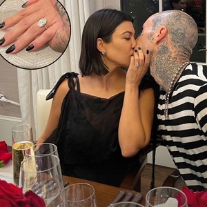 See Her Massive Diamond From Travis Barker Kendall Jenner BFF Hailey Baldwin Reunite For Dinner At Nobu In Twinning Blazers Photos. Kourtney Kardashians engagement ring from Travis Barker Image.
